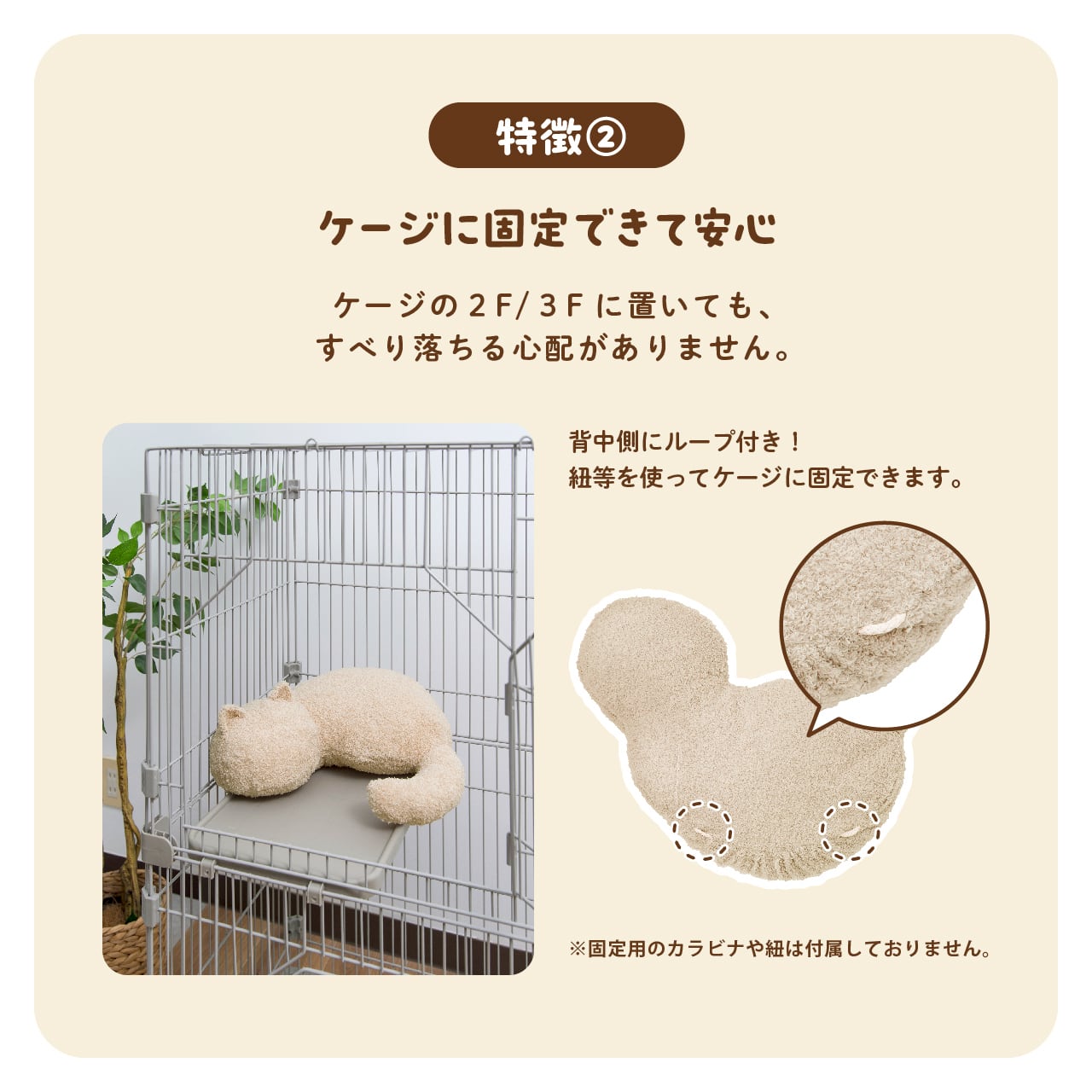 背中側にループがあるので、紐等を使ってケージに固定できます。